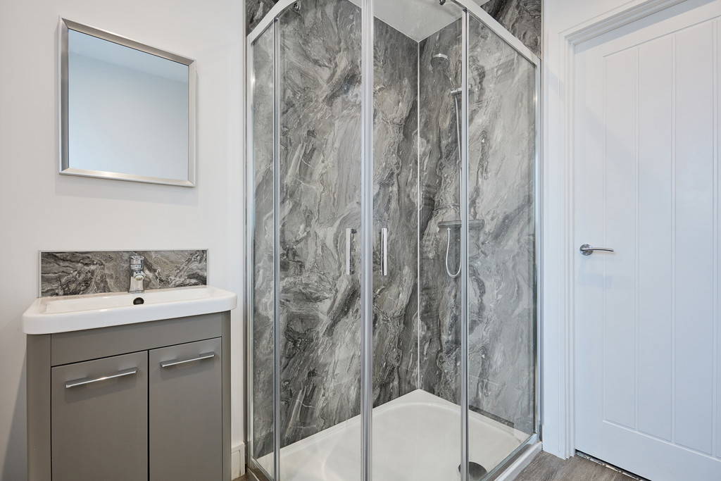 SHOWER ROOM 7' 0" x 6' 0" (2.13m x 1.83m) White suite comprising: low-level close coupled toilet, wash hand basin with vanity unit under and corner shower enclosure with thermostatic shower. Extractor fan. Recessed ceiling spotlights. Wood effect flooring. Chrome heated towel rail radiator. Double glazed Velux window.