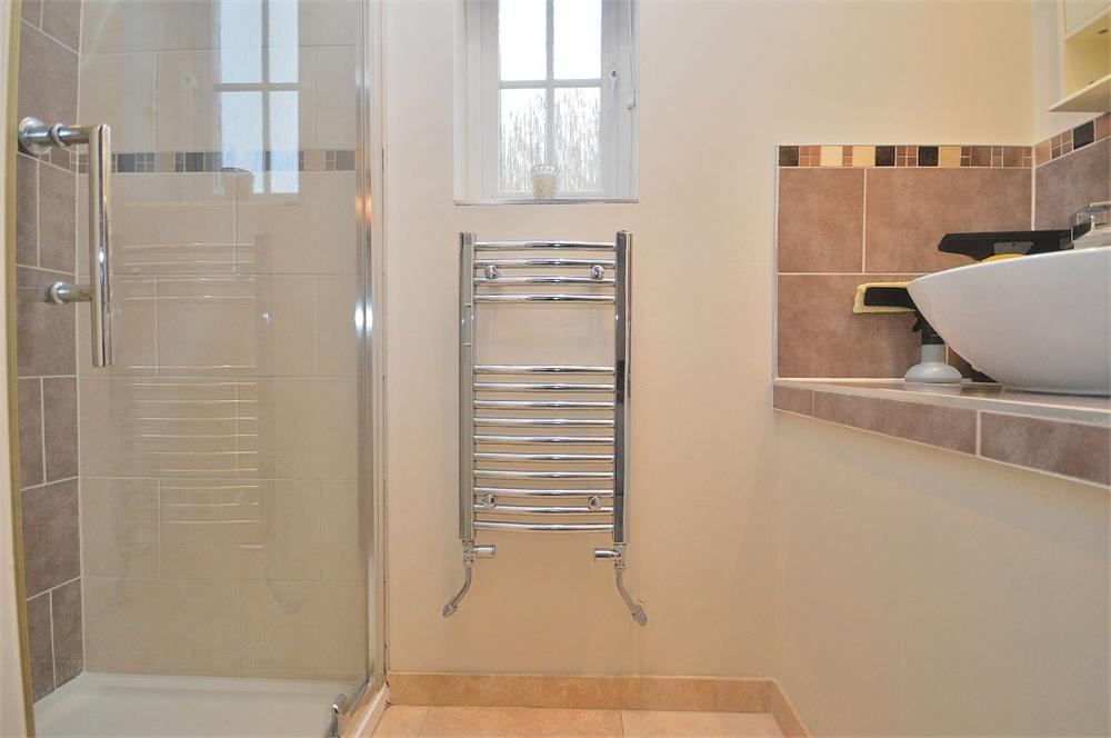 Enclosed shower cubicle. Wash hand basin. Complimentary tiling to splash back areas. Wall mounted heated towel rail. Side aspect double glazed obscure window.