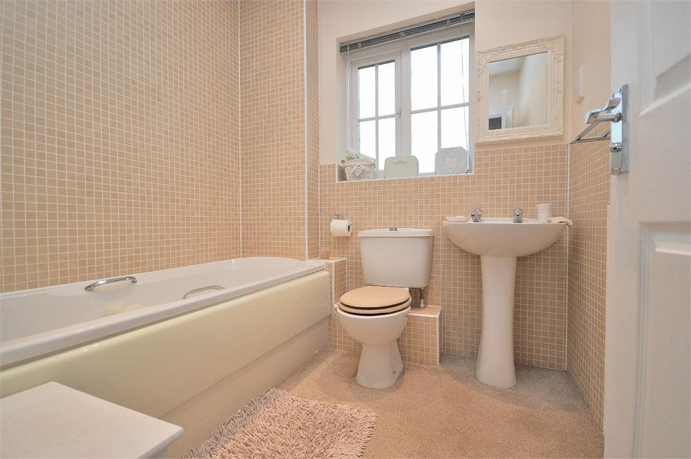Three piece suite comprising: panel enclosed bath with shower head attachment, pedestal wash hand basin and low level flush W.C. Complimentary tiling to splash back areas. Rear aspect double glazed obscure window. Wall mounted radiator.