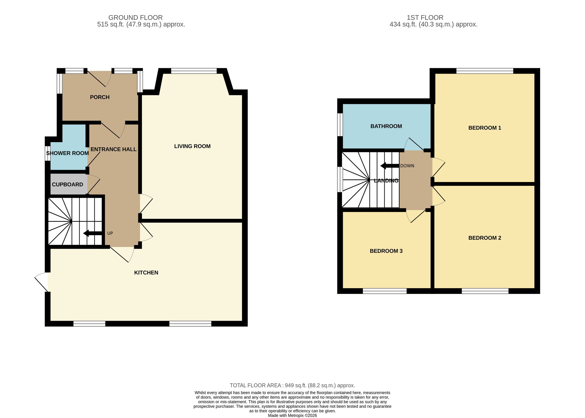 The ground floor comprises a bright living room, a large contemporary kitchen ideal for family living and entertaining, and a stylish downstairs shower room for added convenience. Upstairs, the property benefits from three well proportioned bedrooms and a modern family bathroom, finished to a high standard.