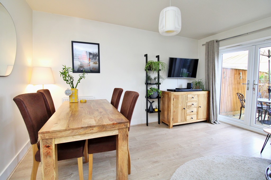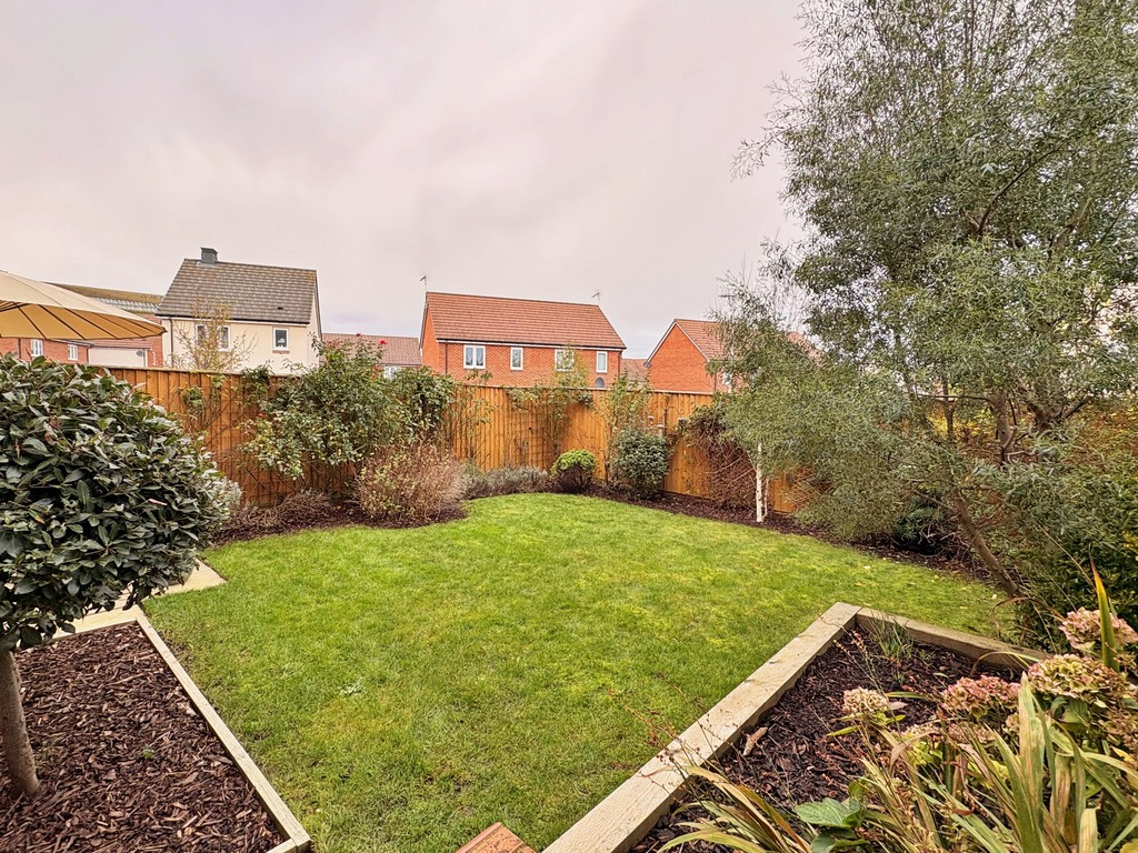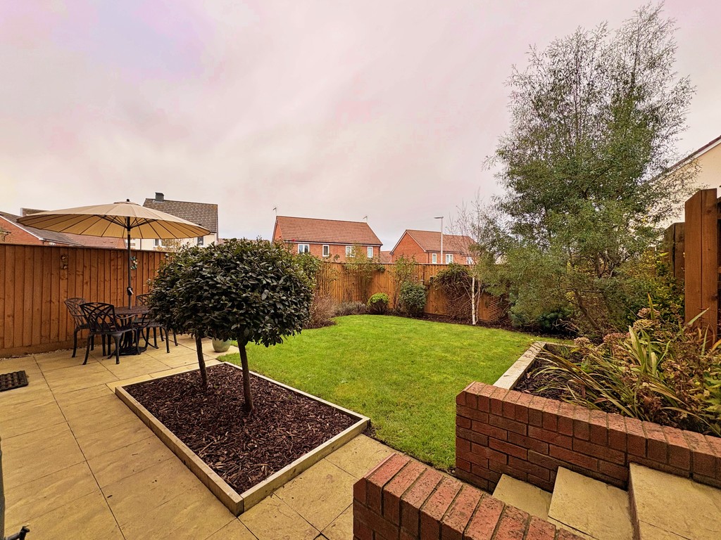 The rear garden is mainly laid to lawn and is fully enclosed by timber fencing, creating a safe and private outdoor space. A paved patio area directly behind the property offers the perfect spot for outdoor seating and al fresco dining.