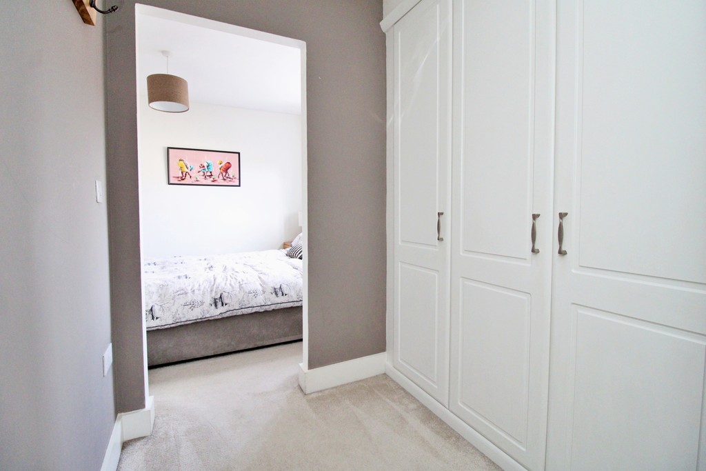 Bedrooms two and three are positioned to the front elevation, with bedroom two further enhanced by built-in double wardrobes. The family bathroom is fitted with a panelled bath with glass screen and shower, WC, pedestal wash hand basin, and heated towel radiator.