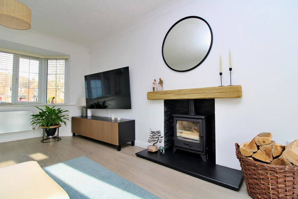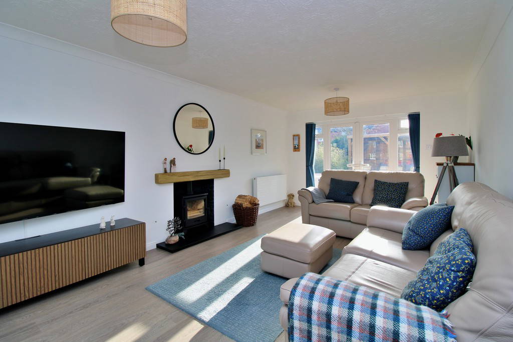 The ground floor accommodation is both welcoming and versatile, beginning with a spacious galleried entrance hall that creates an immediate sense of light and space. The principal living room is generously proportioned and features double opening doors leading directly onto the rear garden, providing a seamless connection between indoor and outdoor living. A particular highlight is the log-burning stove, installed in 2022, which adds both character and warmth to the home.