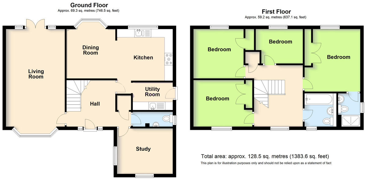 To the first floor, the property offers four well-proportioned bedrooms, all thoughtfully laid out and ideal for family occupation. The principal bedroom benefits from a modern en-suite shower room, while the remaining bedrooms are served by a contemporary family bathroom, completing the first-floor accommodation.