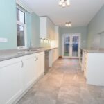 KITCHEN 18' 0" x 8' 3" (5.49m x 2.51m) A range of eye and base level Shaker style kitchen units surmounted by contrasting roll-edge worksurfaces with integrated splashback's. Inset stainless steel sink and drainer with mixer tap over. Built-in stainless steel single electric oven and four ring black ceramic induction hob. Space and plumbing for a washing machine and slimline dishwasher. Space for two undercounter appliances along with space for a full height fridge freezer. Concealed combination central heating boiler. Tiled floor. UPVC double glazed window to the side aspect. UPVC double glazed patio doors to the rear garden.