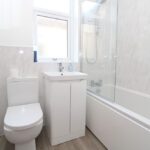 FAMILY BATHROOM 6' 7" x 5' 4" (2.01m x 1.63m) Refitted white suite comprising: low-level close coupled toilet, wash hand basin with vanity unit under and panelled bath with electric shower over. Panelling to splashback areas. Wood effect flooring. Radiator. Obscure uPVC double glazed window to the side aspect.