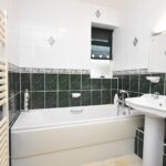 Fitted with a white three-piece suite comprising panelled bath with shower attachment, pedestal wash hand basin, and WC. The room is fully tiled with decorative detailing and features an obscured window for natural light and privacy.