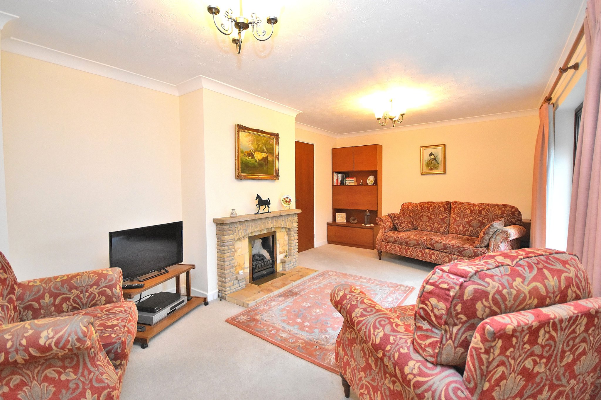 Set within a quiet cul-de-sac, the property enjoys a neatly maintained front lawn with a block-paved driveway providing off-road parking and leading to a detached double garage.