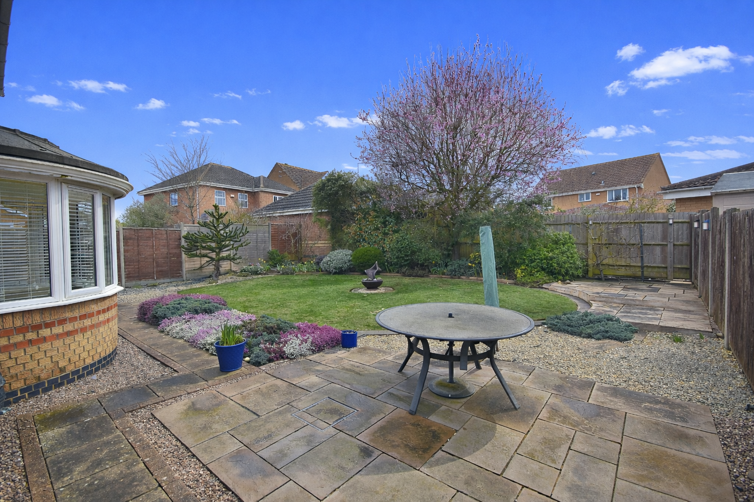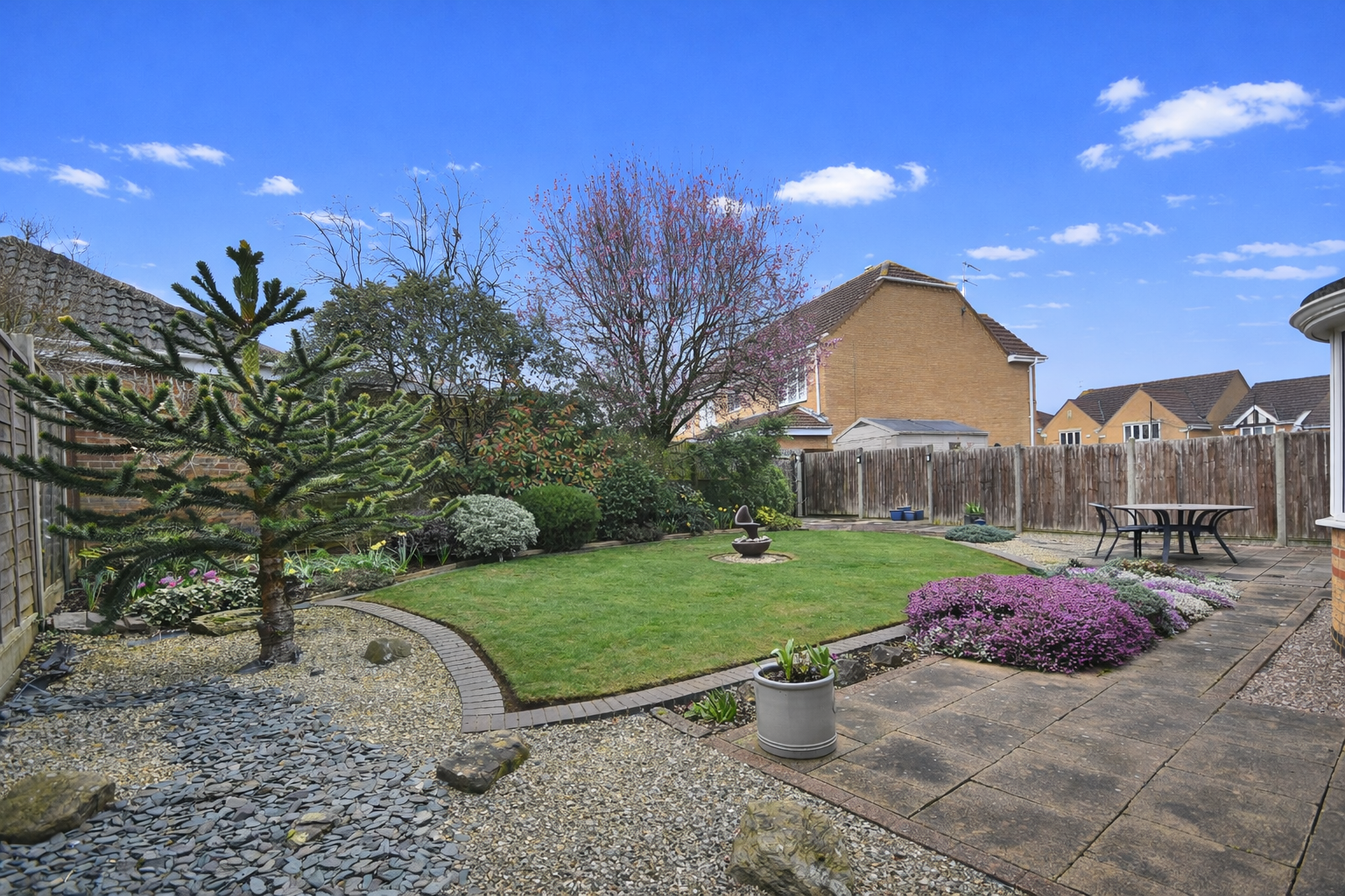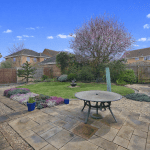 An established landscaped garden which contains paved patios with a lawn centre piece, surrounded by established boarders containing shrubbery and small trees. Enclosed with timber panelled fencing, with gated pedestrian access to the side.
