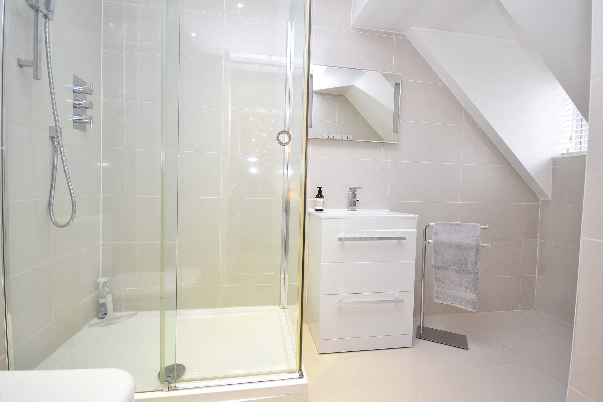 9' 7" x 6' 2" (2.92m x 1.88m) Four piece suite comprising of; Walk in shower unit, bath with shower over, hand level basin and low flush W/C. Double glazed UPVC window to the rear aspect.