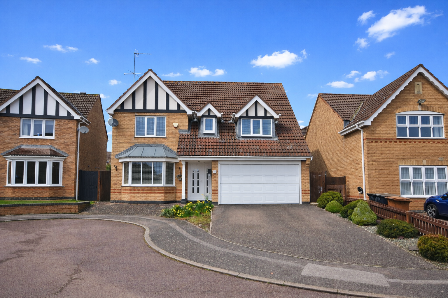 Small lawn and shrub boarder with pathway leading to the front entrance. Double width driveway, leading to the integral double garage.