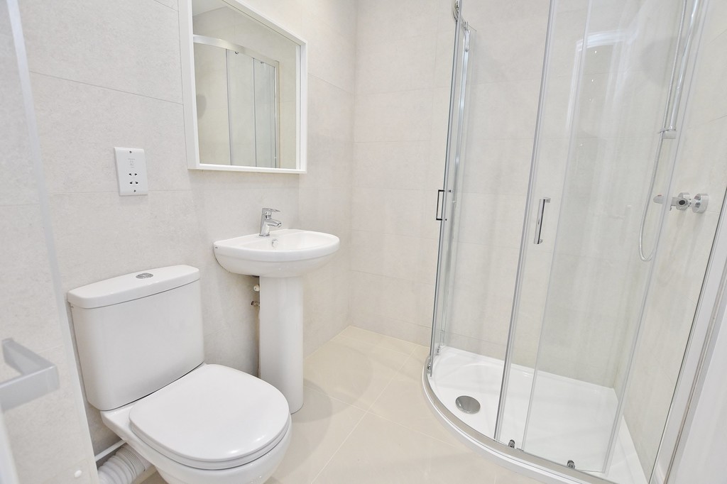 SHOWER ROOM 6' 4" x 5' 5" (1.93m x 1.65m) White suite comprising: low-level close coupled toilet, pedestal wash and basin and fully tiled shower enclosure. Majority tiled walls. Tiled floor. Recessed ceiling spotlights. Ceiling mounted extractor fan. Electric shaver socket. Chrome heated towel rail radiator.