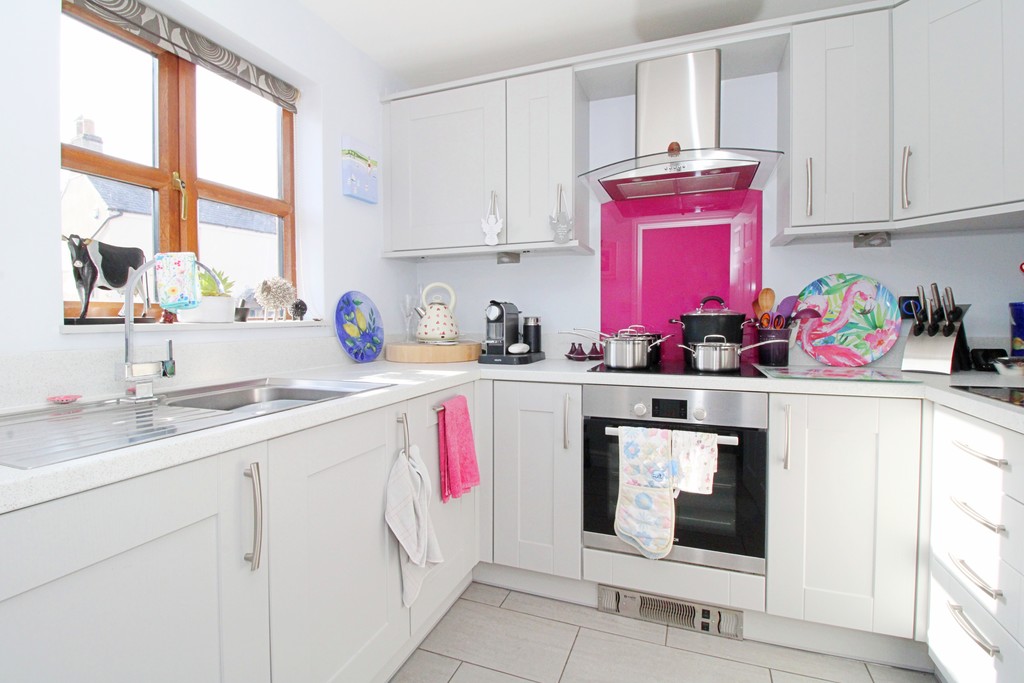 KITCHEN 8' 8" x 7' 11" (2.64m x 2.41m) A range of shaker style eye and base level units surmounted by complementary worktops. Inset stainless steel sink and drainer with mixer tap over. Built in stainless steel single electric oven, four ring ceramic induction hob and chimney extractor hood. Integrated fridge, freezer, washing machine and slimline dishwasher. Tiled floor. Floor level warm air heater. uPVC double glazed window to the front aspect.