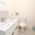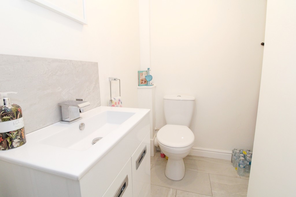 CLOAKROOM White suite comprising: wash hand basin with vanity unit under and low-level close-coupled toilet. Tiled floor. Wall mounted extractor fan. Under stairs storage area.