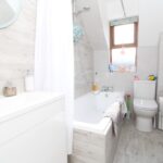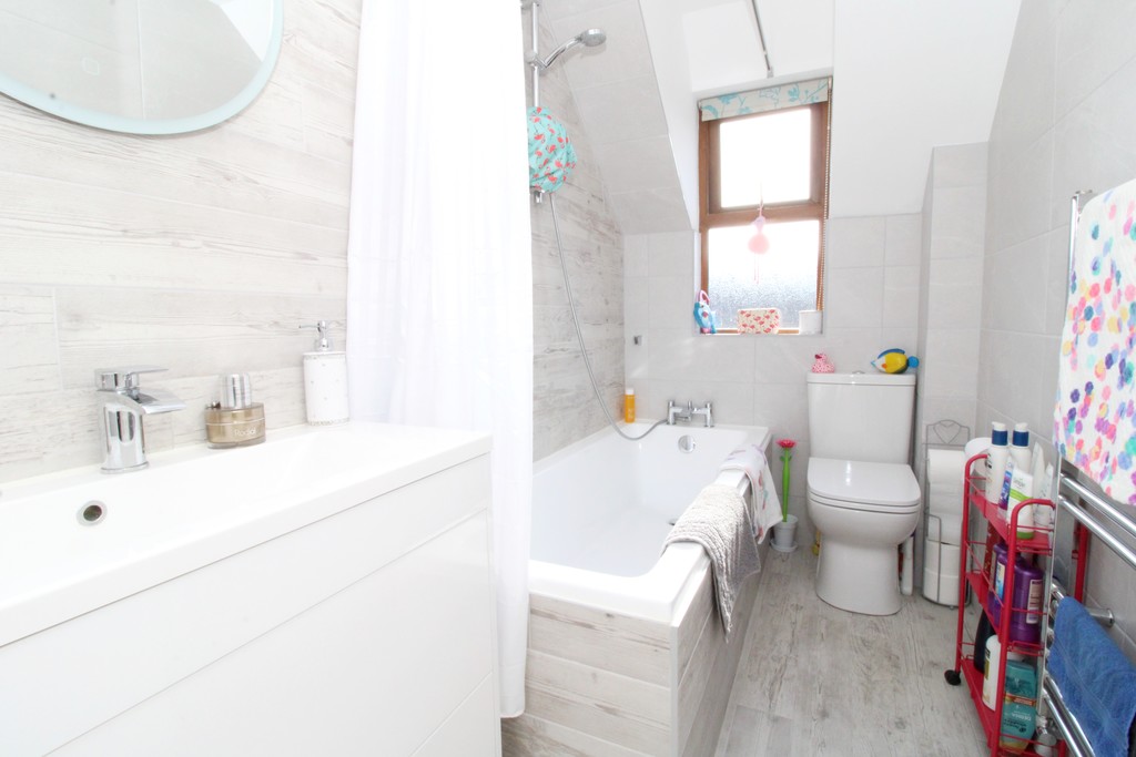 BATHROOM 8' 7" x 4' 7" (2.62m x 1.4m) White suite comprising: wash hand basin with vanity unit under, low-level close-coupled toilet and panelled bath with mixer tap and wall mounted shower attachment. Fully tiled walls and floor. Ceiling mounted extractor fan. Chrome heated towel rail radiator.