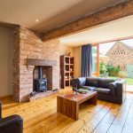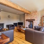 The light, airy and spacious lounge / living / family room has a large ceiling beam from the original barn, two cast-iron radiators, recessed ceiling spotlights / dimmable downlights, reclaimed pine floorboards and a large, inglenook-style brick and beam fireplace with exposed brick hearth and an inset, coal-effect gas fire.
