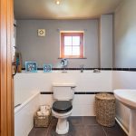 The family bathroom has a white ceramic suite, comprising panelled bath, black and white ceramic tiling, pedestal washbasin and low-flush WC.