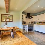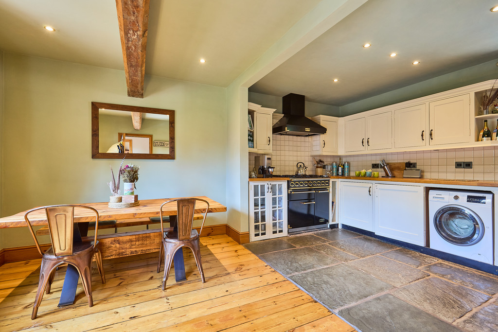 The bespoke, open-plan, country-style kitchen / dining / breakfast room - a fantastic family room - also overlooks the enclosed, south-facing garden and features solid beech work surfaces, a large ceiling beam from the original barn, a ceramic, farmhouse-style Butler sink, a Falcon five-ring dual-fuel range oven, recessed ceiling spotlights / dimmable downlights, natural flagstone floor, and reclaimed wooden floorboards.