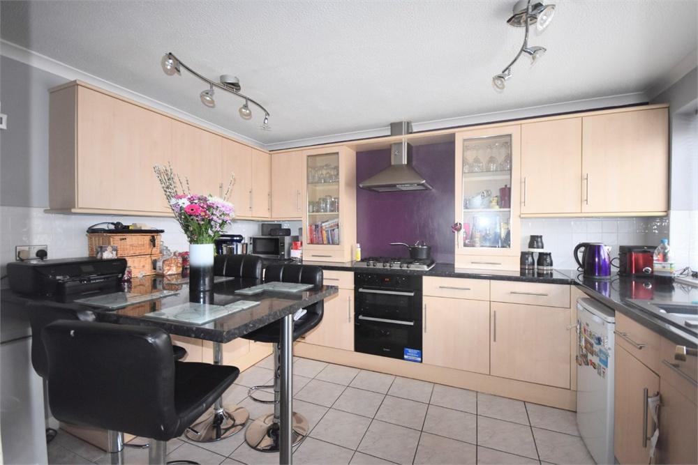 3.78m x 3.10m (12' 5" x 10' 2") Fitted with a range of wall and base units with roll edge work surfaces over and built in breakfast bar, five ring gas hob, double oven, space and plumbing for appliances, poly carbonate sink with mixer and drainer, tiled flooring, window to front, radiator.