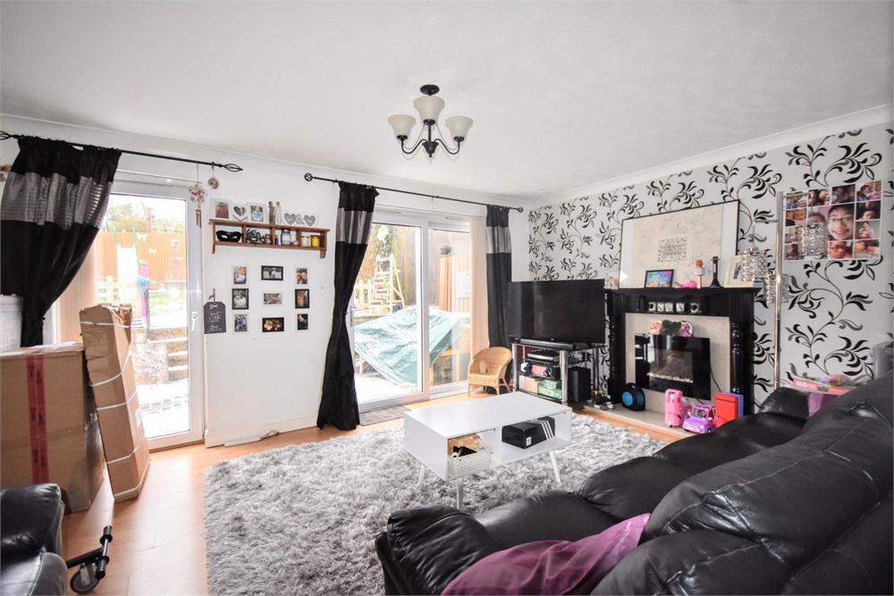 3.68m x 4.98m (12' 1" x 16' 4") Large lounge with patio doors and door to rear, electric fire with ornate surround, laminated flooring.