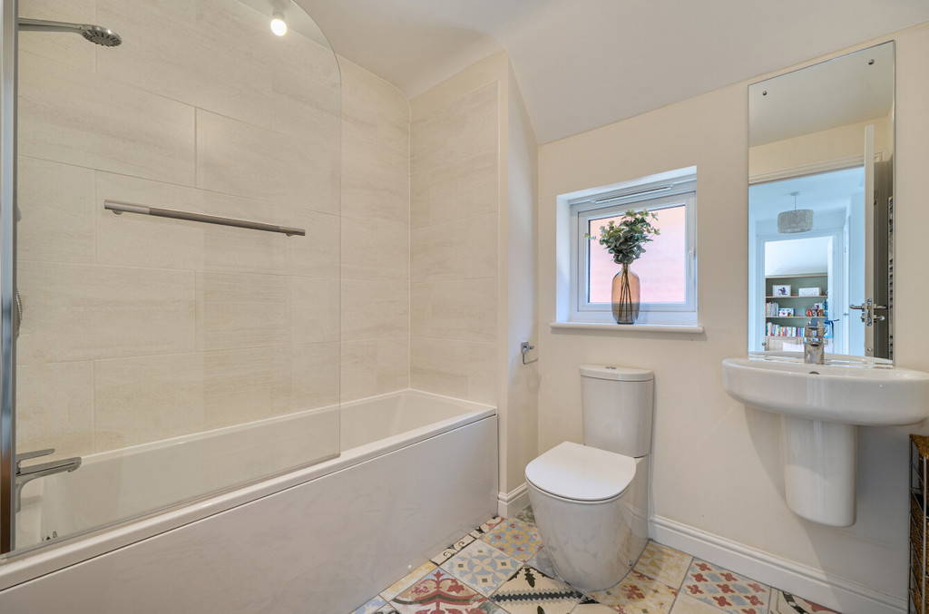Upstairs, the property continues to impress with four generously proportioned double bedrooms. The principal bedroom is particularly well-appointed and includes a stylish en suite shower room. A contemporary family bathroom serves the remaining bedrooms, finished to a high standard.