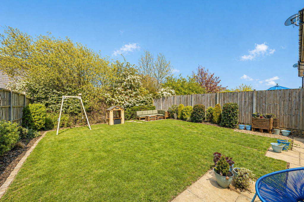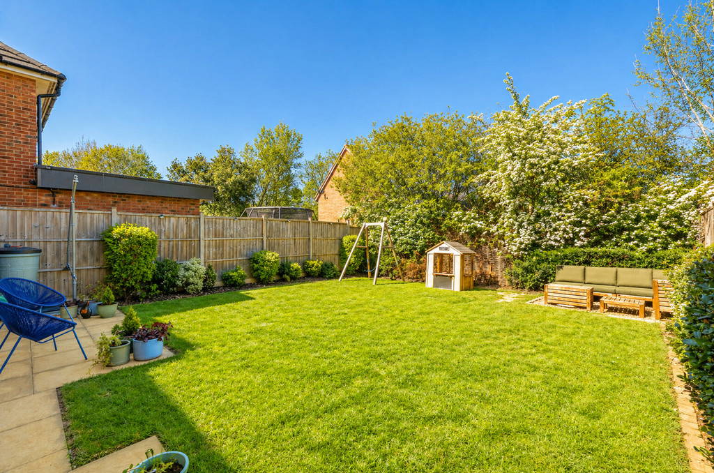 Externally, the property benefits from a generous driveway providing ample off-road parking and leading to a single integrated garage. The rear garden has been thoughtfully arranged to offer a private and well-maintained outdoor space, featuring a lawn, patio seating area, and further rear seating area, ideal for both entertaining and family use.