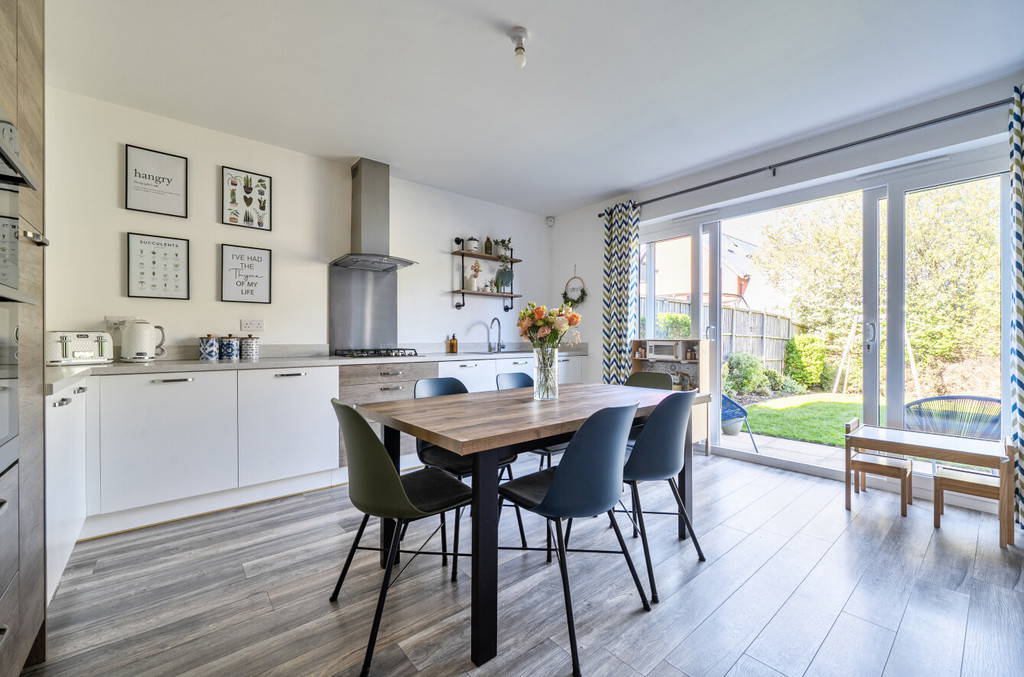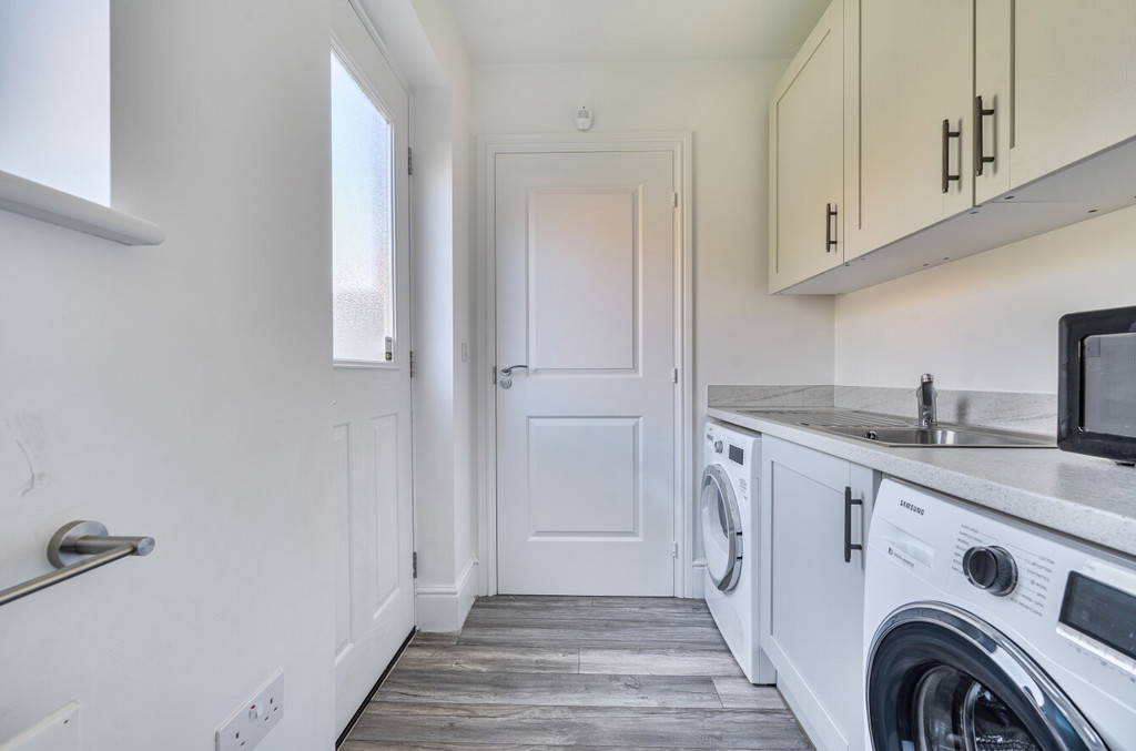 To the rear, the home opens into a stunning open-plan kitchen dining room, designed as the true heart of the home. Featuring a range of upgraded integrated appliances, sleek cabinetry, and generous work surfaces, this space is perfectly suited to both everyday living and entertaining. Large doors allow natural light to flood in and provide seamless access to the garden. A separate utility room adds further convenience, along with a well-appointed ground floor WC.