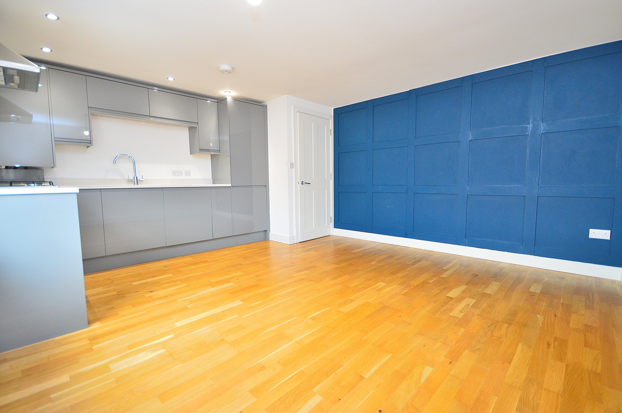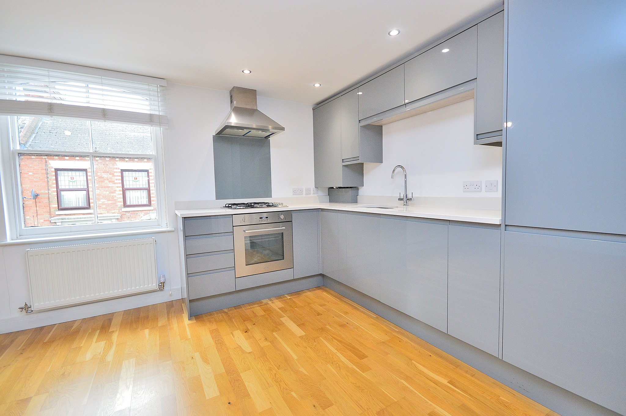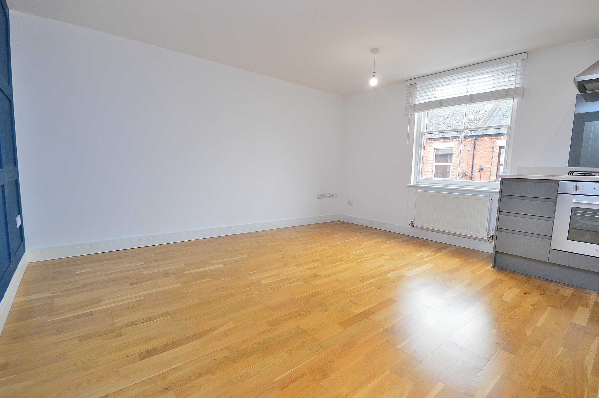 14' 11" x 13' 6" (4.55m x 4.11m) A spacious living are boasting a large window with a fitted kitchen area. The kitchen is fitted in a modern and elegant style and features integrated appliances and modern tiling. Oak flooring. Radiator.
