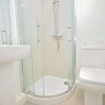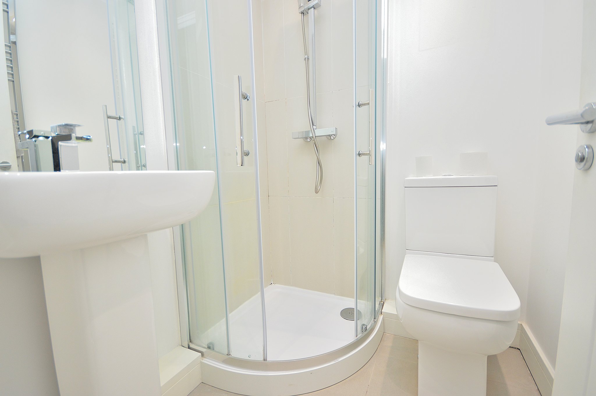 Three piece suite comprising: Low flush WC. Pedestal wash hand basin. Enclosed shower cubicle. Tiled to water sensitive areas. Chrome heated towel rail.