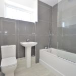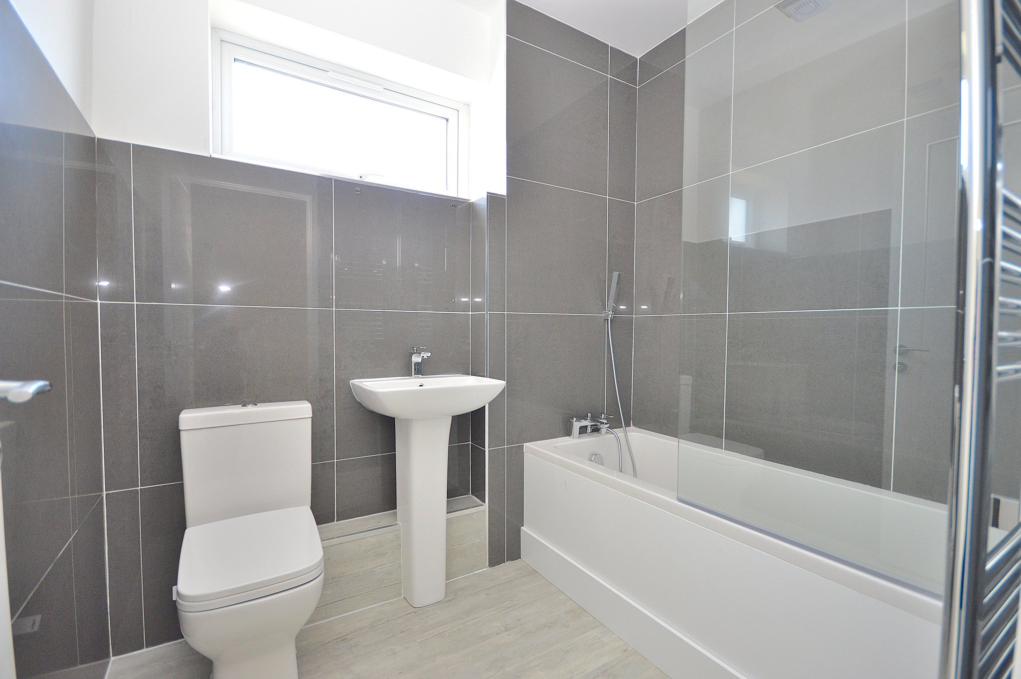 Three piece suite comprising: Low flush Wc. Pedestal wash hand basin. Panelled bath with shower over. Obscured double glazed window to the side aspect. Chrome heated towel rail.