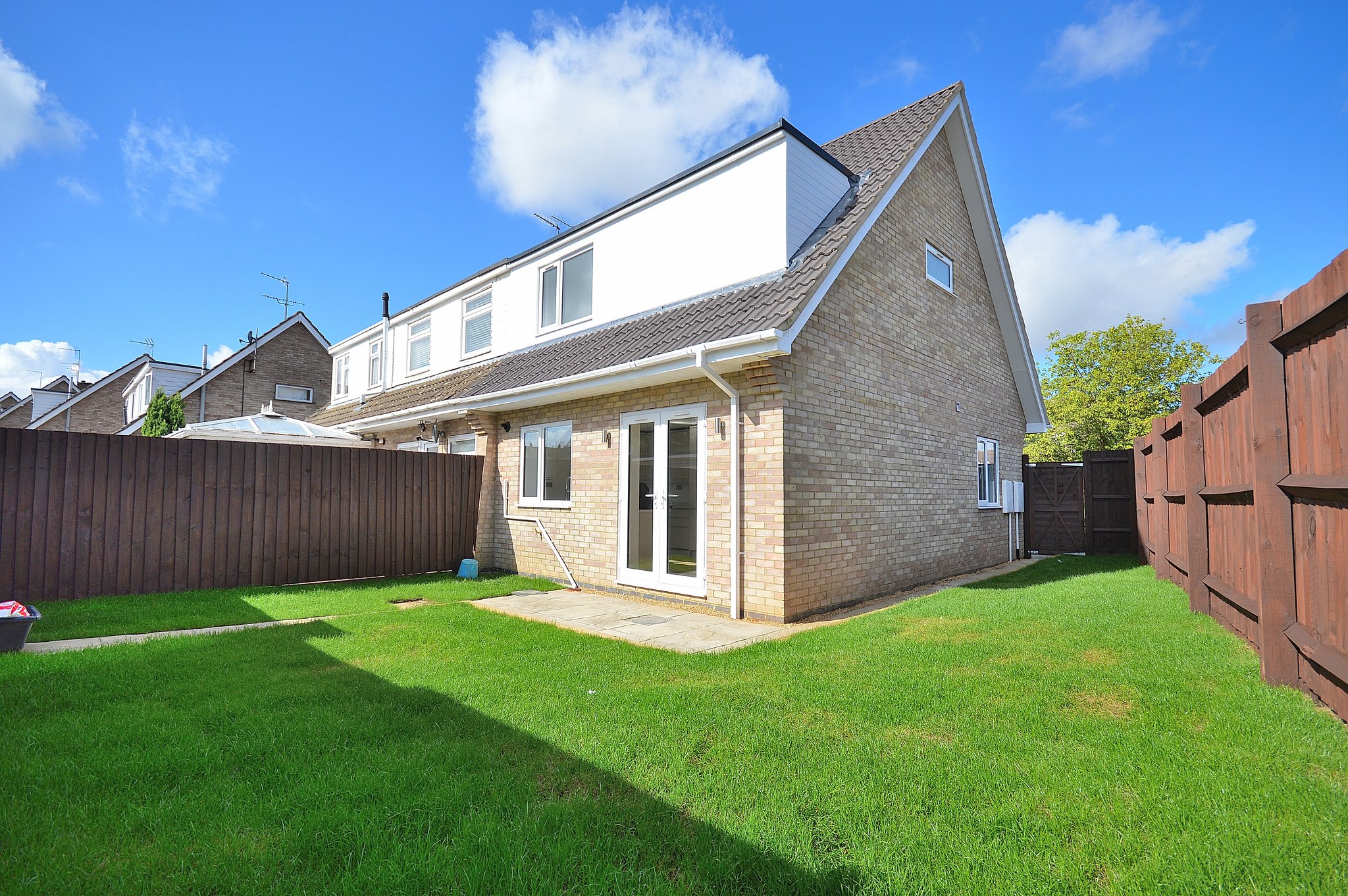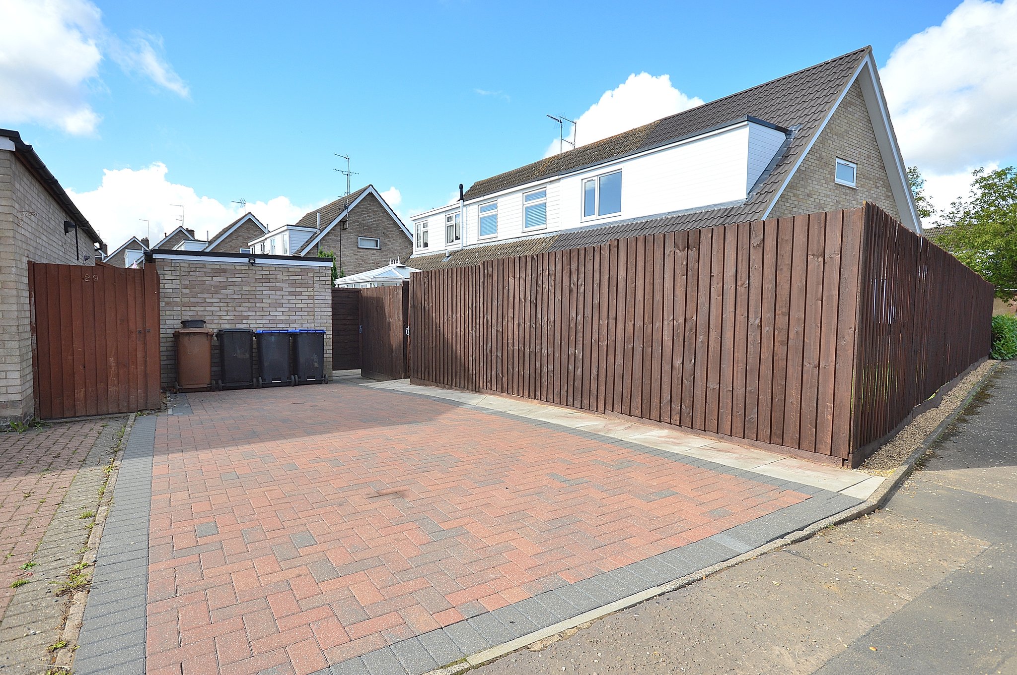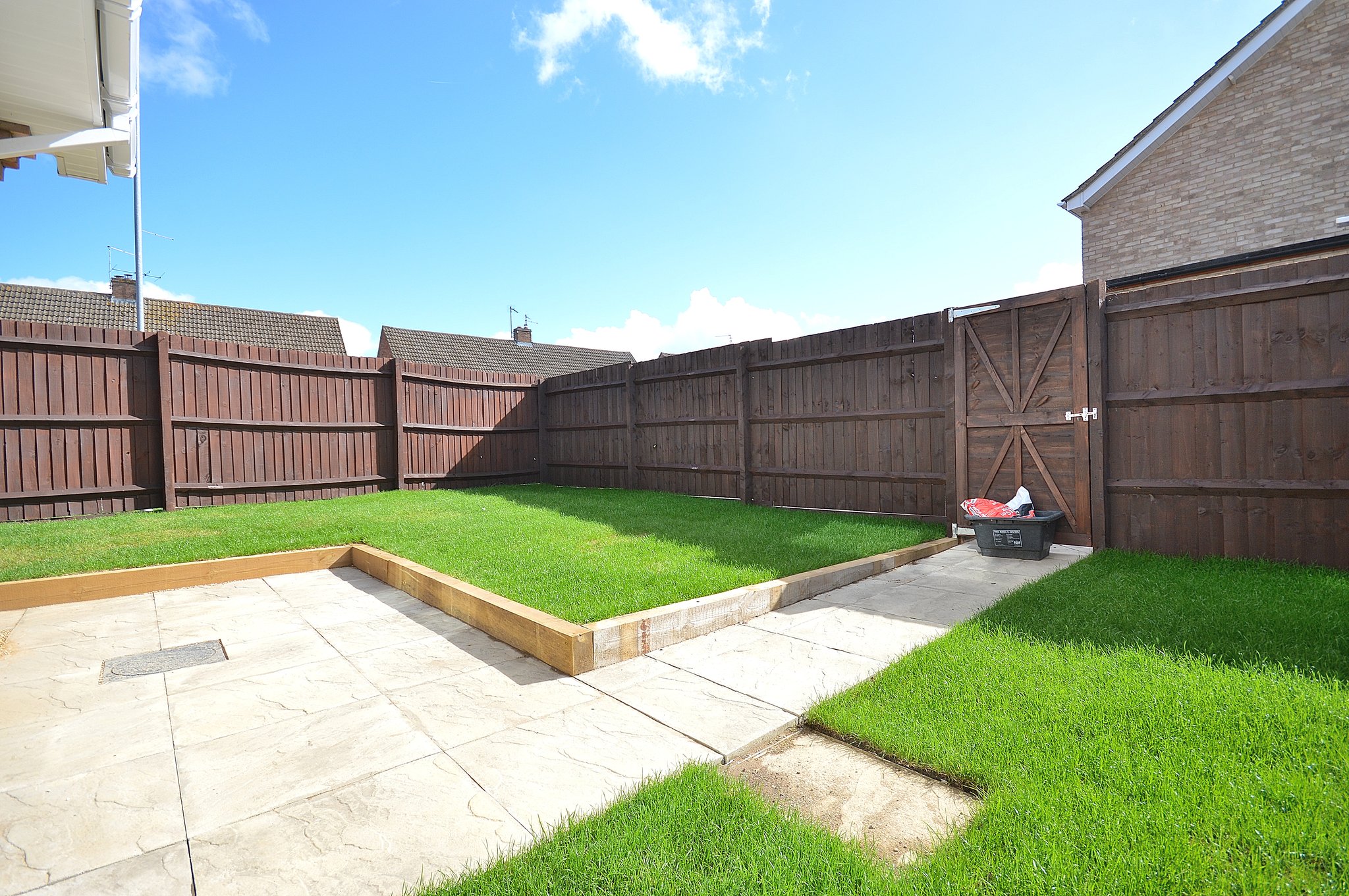 Paved patio area leading to a raised lawn. Rear gated leading to a driveway providing off road parking.