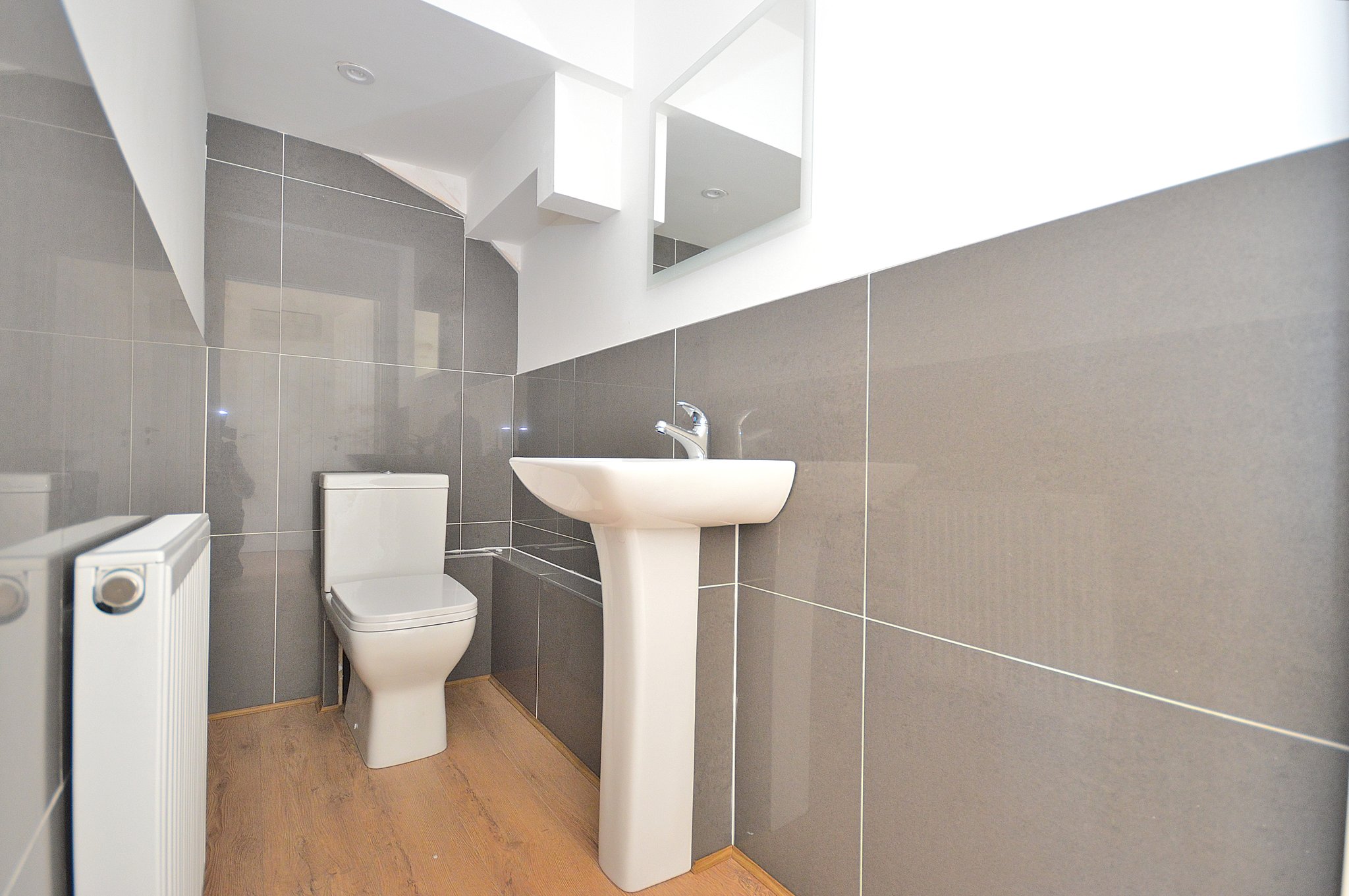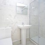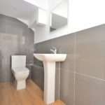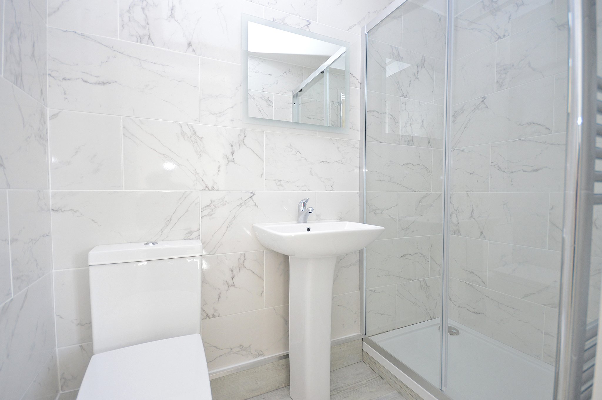 Three piece suite comprising: Low flush Wc. Pedestal wash hand basin. Enclosed shower cubicle. Fully Tiled. Chrome heated towel rail.