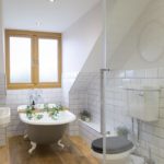 BATHROOM Stand alone cast iron bath. Wash hand basin with pedestal and separate taps. Shower cubicle with mixer shower. Tiled wall. Irish obscure oak window to rear elevation.