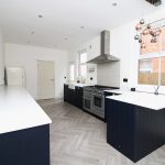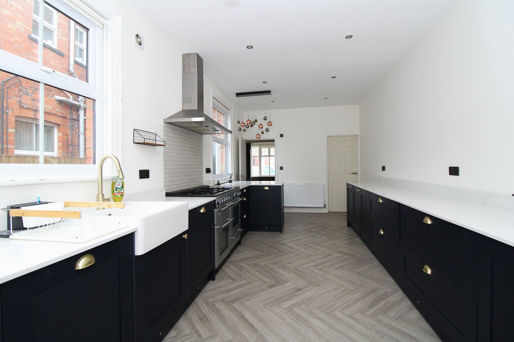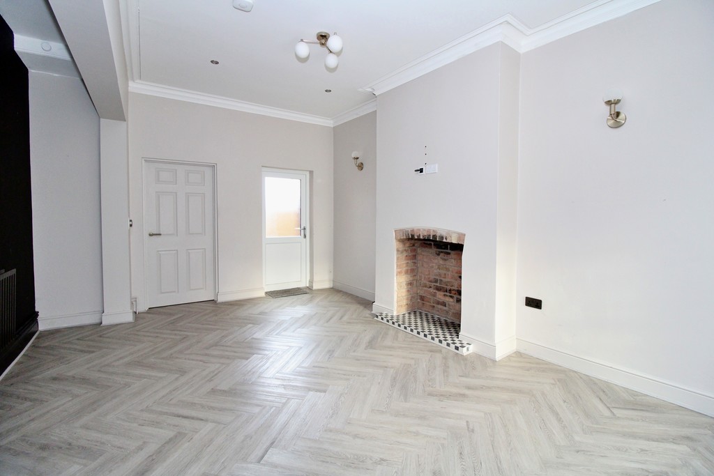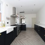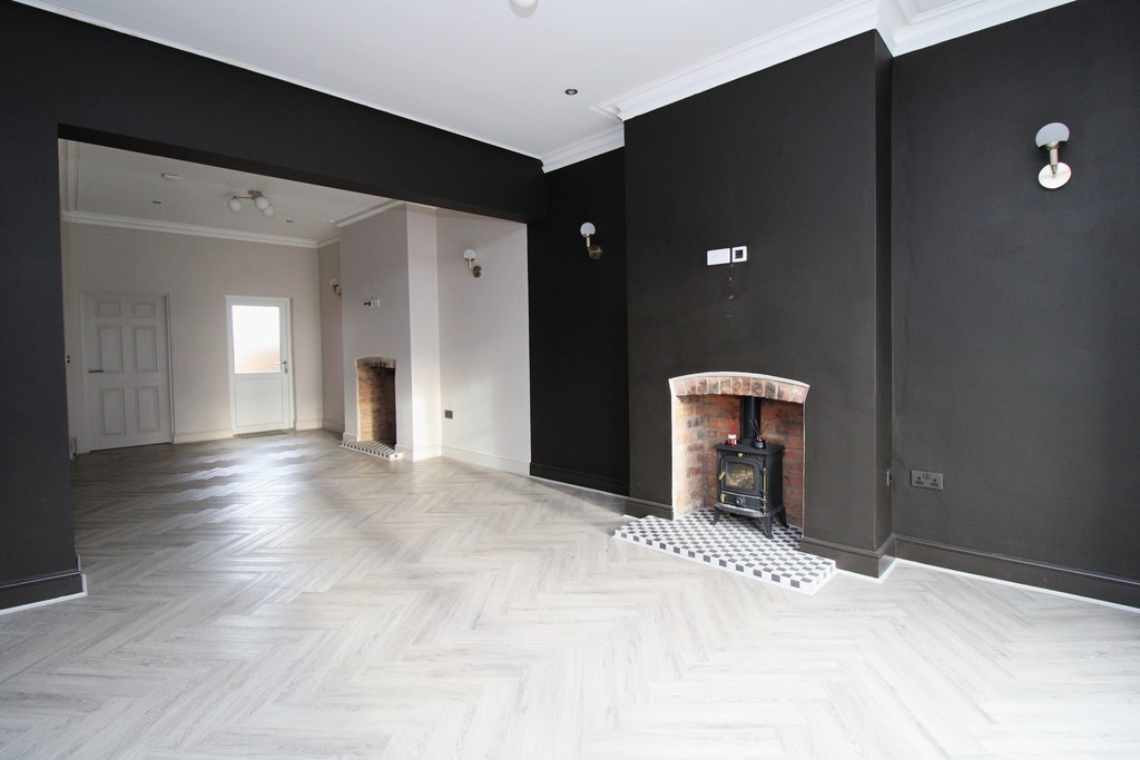 The accommodation is entered via a welcoming reception hallway featuring attractive Minton-style tiled flooring. To the ground floor is a generous lounge/dining room with a feature fireplace incorporating a wood-burning stove, creating a warm and inviting living space. The refitted kitchen is finished to a high standard, offering shaker-style units, quartz worktops and luxury herringbone-effect vinyl flooring. This is complemented by a separate utility room and a cloakroom/WC. The property further benefits from a cellar, providing additional storage.
