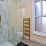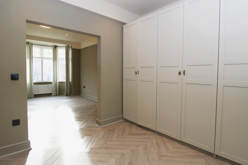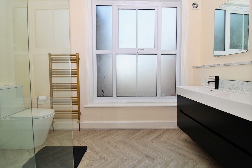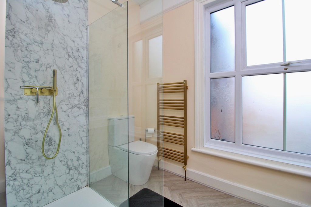 The first floor hosts the impressive principal bedroom, which enjoys a substantial dressing area with fitted wardrobes and access to a stylish en suite shower room, complete with a walk-in shower, his-and-hers sinks, radiator and underfloor heating. This floor also offers two further well-proportioned bedrooms and a beautifully refitted family bathroom featuring a four-piece suite, including a freestanding roll-top bath and separate shower cubicle.
