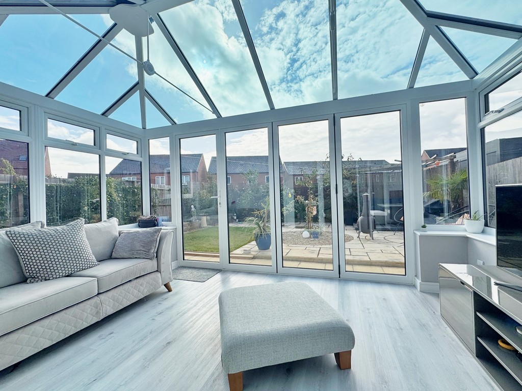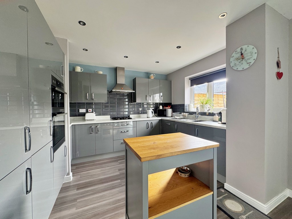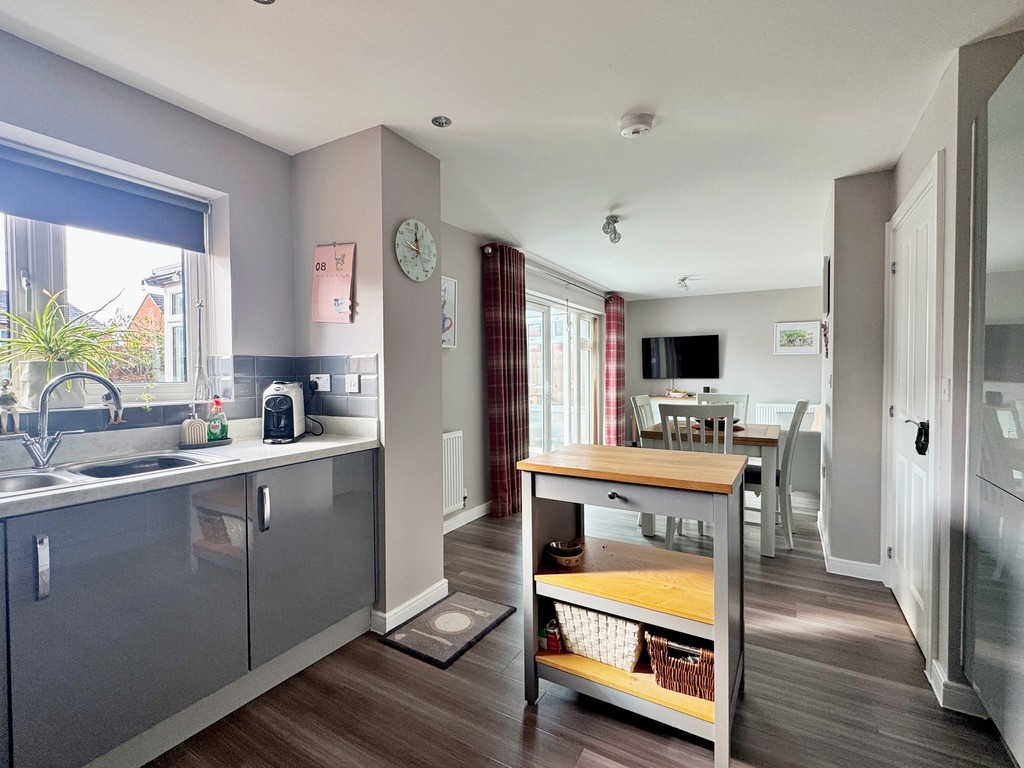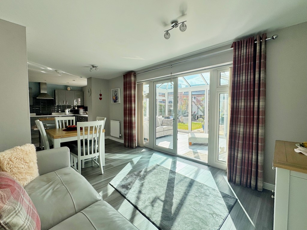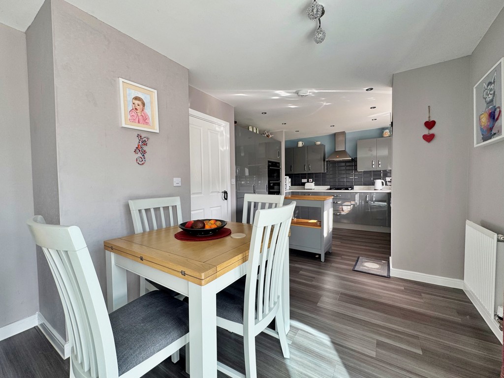 Internally, the accommodation has been thoughtfully designed for modern family lifestyles and provides a generous, well-planned layout across two floors. The ground floor comprises a welcoming entrance hallway with cloakroom/W.C., a bright and spacious lounge, and a contemporary fitted kitchen that flows seamlessly into an open-plan dining and family area. This space enjoys direct views over the rear garden and is further enhanced by the addition of a large uPVC conservatory, offering an extra versatile living area ideal for entertaining or relaxing.
