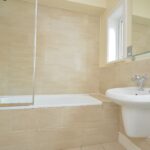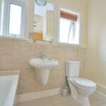 Three piece suite comprising: Low flush Wc. Wash hand basin. Bath with shower. Obscured double glazed window to the side aspect. Chrome heated towel rail.