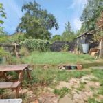 Patio area leading to lawn with a pathway leading to the rear timber gate. Timber built shed.
