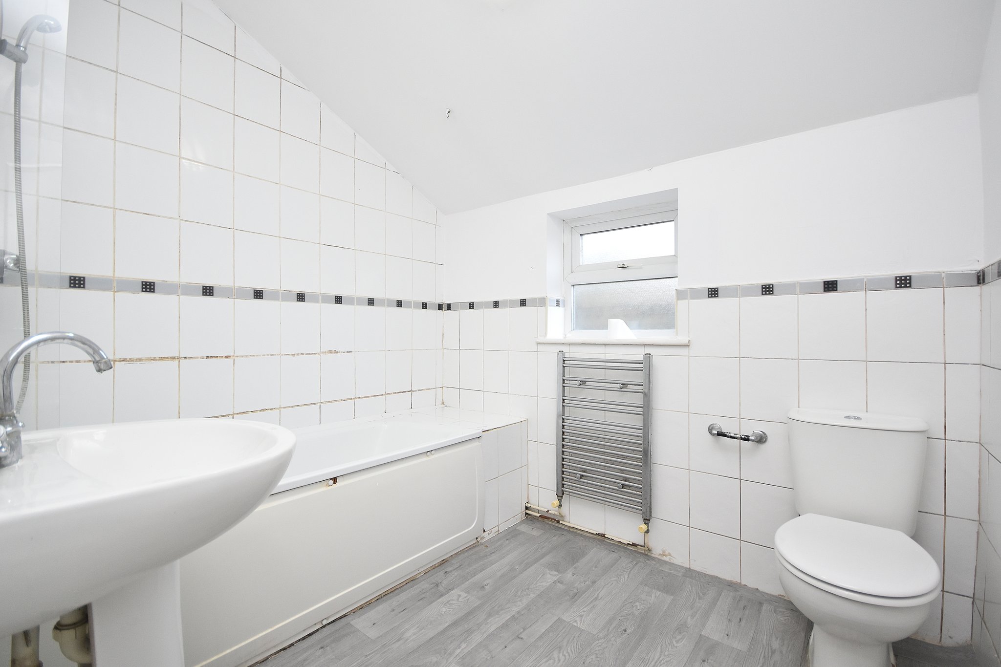 Comprising of; Three piece bathroom suite, including; Bath with shower over. Heated towel rail. W/C. Hand wash basin with pedestal. Window to the rear aspect.