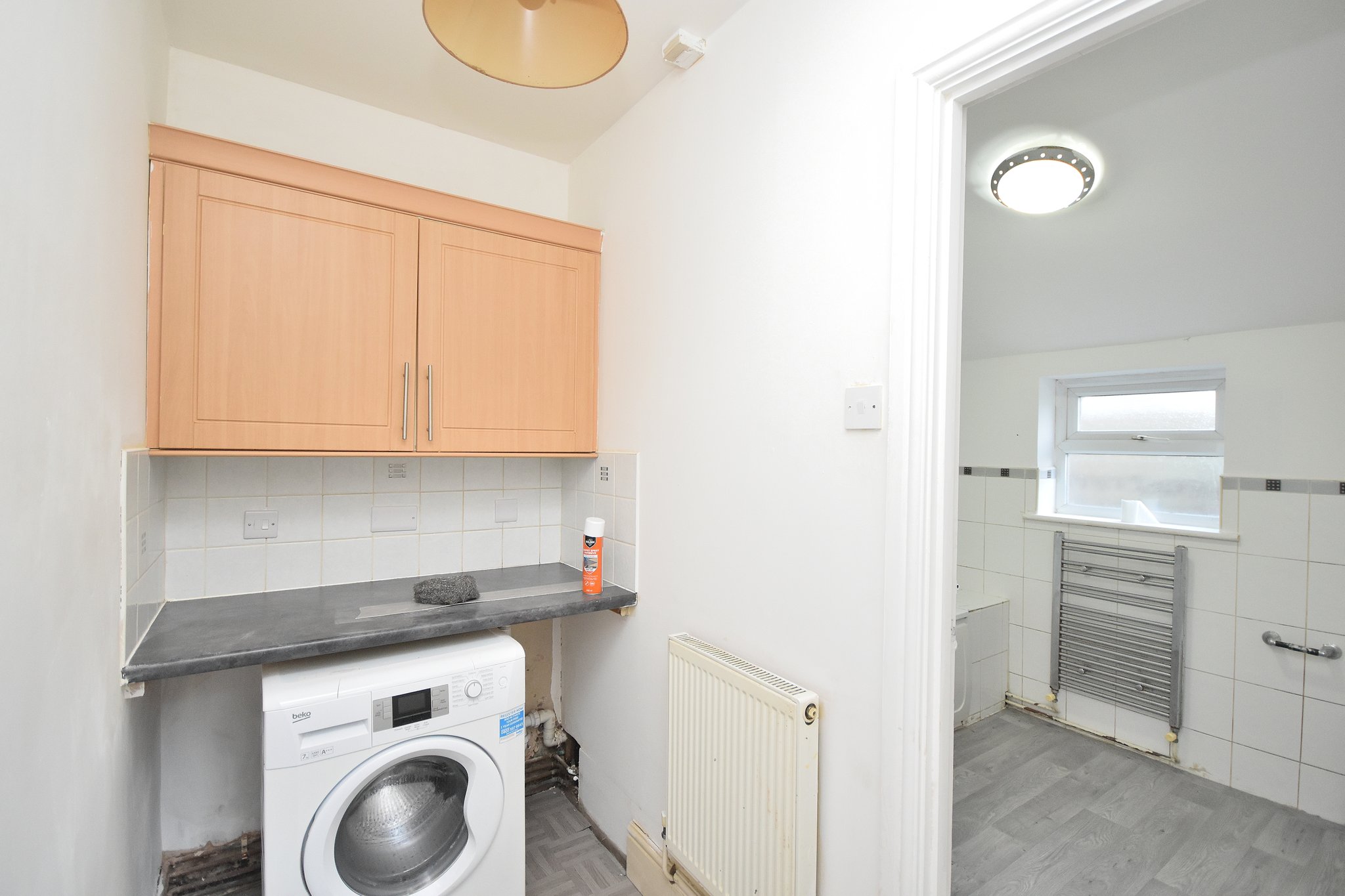 Comprising of; Space and plumbing for washing machine. Laminate tile flooring. Eye level kitchen units. Door leading to rear garden.
