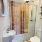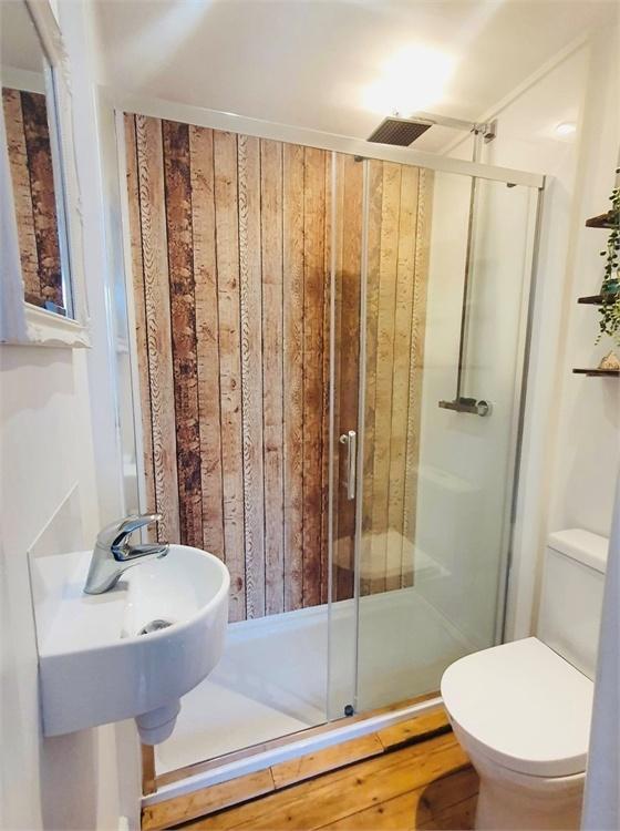 4' 8" x 4' 7" (1.42m x 1.40m) Comprising shower cubicle, wash hand basin with vanity unit and low level w.c. Tiled splash back. Exposed wooden floorboards.