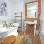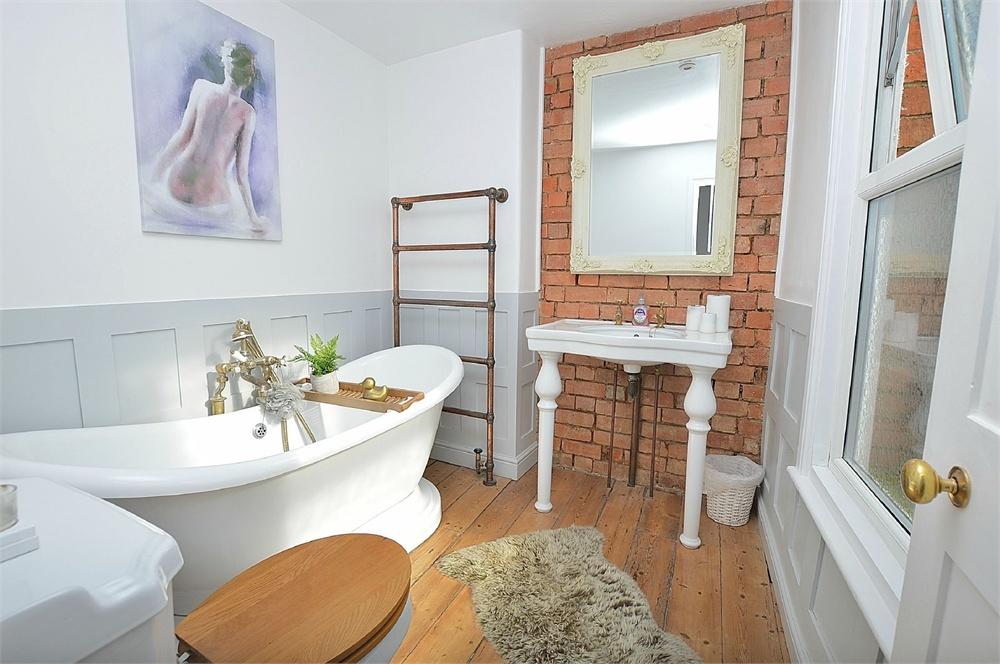 7' 6" x 6' 11" (2.29m x 2.11m) White suite with stand alone roll top bath, wash hand basin and low level w.c. Heated towel rail. Exposed wooden floorboards,. Exposed brick. UPVC double glazed window to rear.