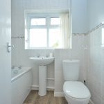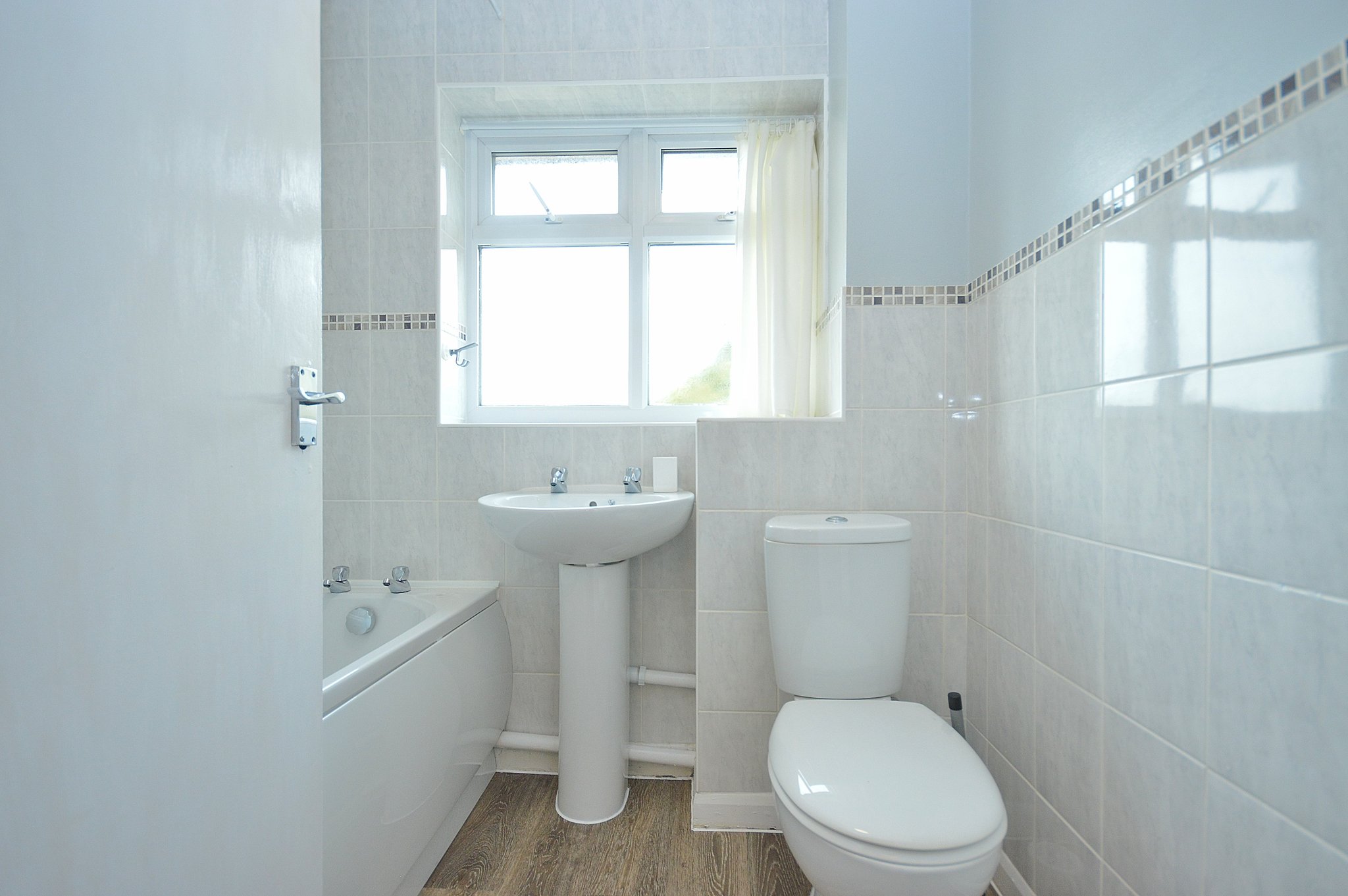 Three piece suite comprising: Low flush Wc. Pedestal wash hand basin. Panelled bath with shower head over. Radiator. Obscured double glazed window to the side aspect.