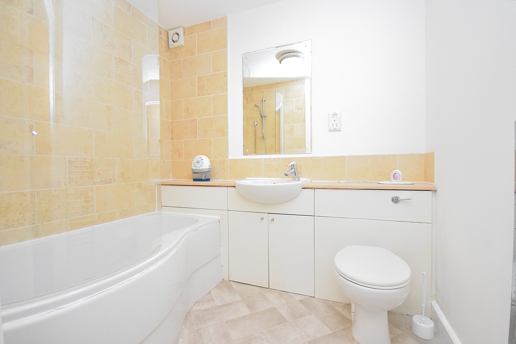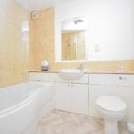 Three piece suit comprising: Low flush Wc. Vanity unit with hand basin mounted over. Panelled bath with shower over. Shower screen. Chrome heated towel rail. Tiled to water sensitive areas.