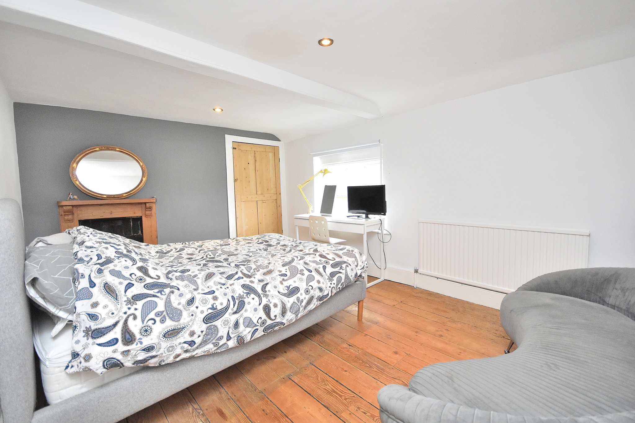 14' 0" x 10' 1" (4.27m x 3.07m). Wooden floorboards, window to the front aspect, radiator and storage space. Also a fireplace.