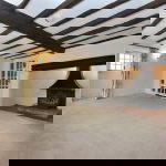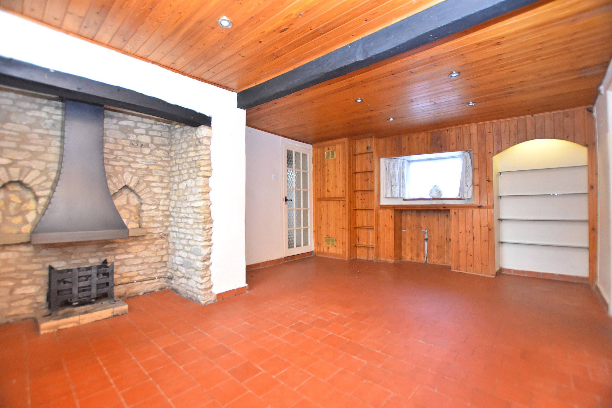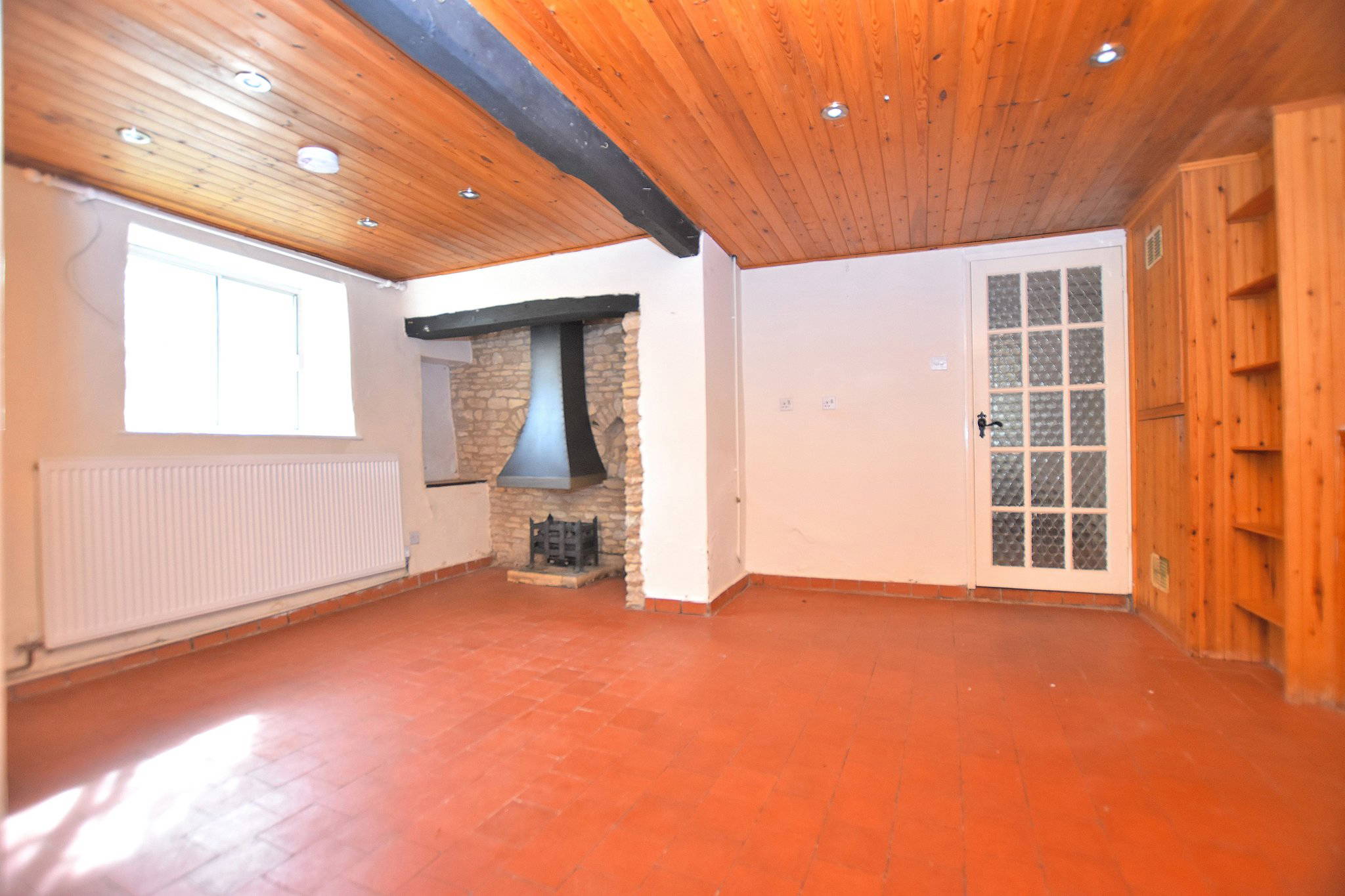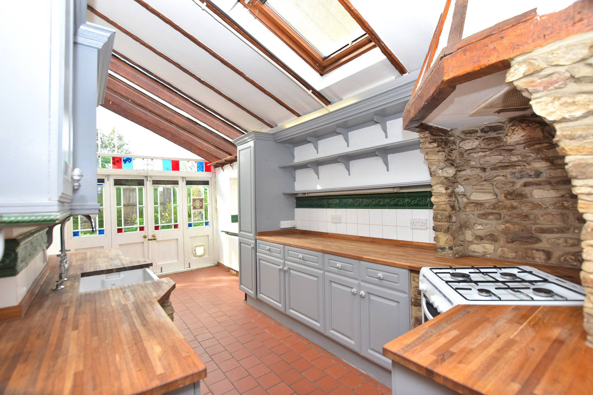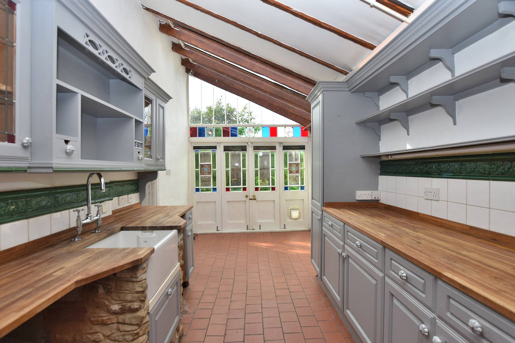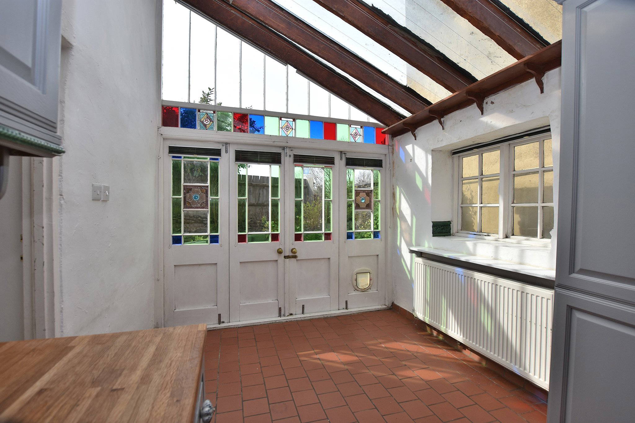 To the rear, decorative glazed doors and windows with coloured detailing open out to the garden, creating a bright and inviting space with a strong connection to the outdoors.