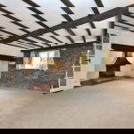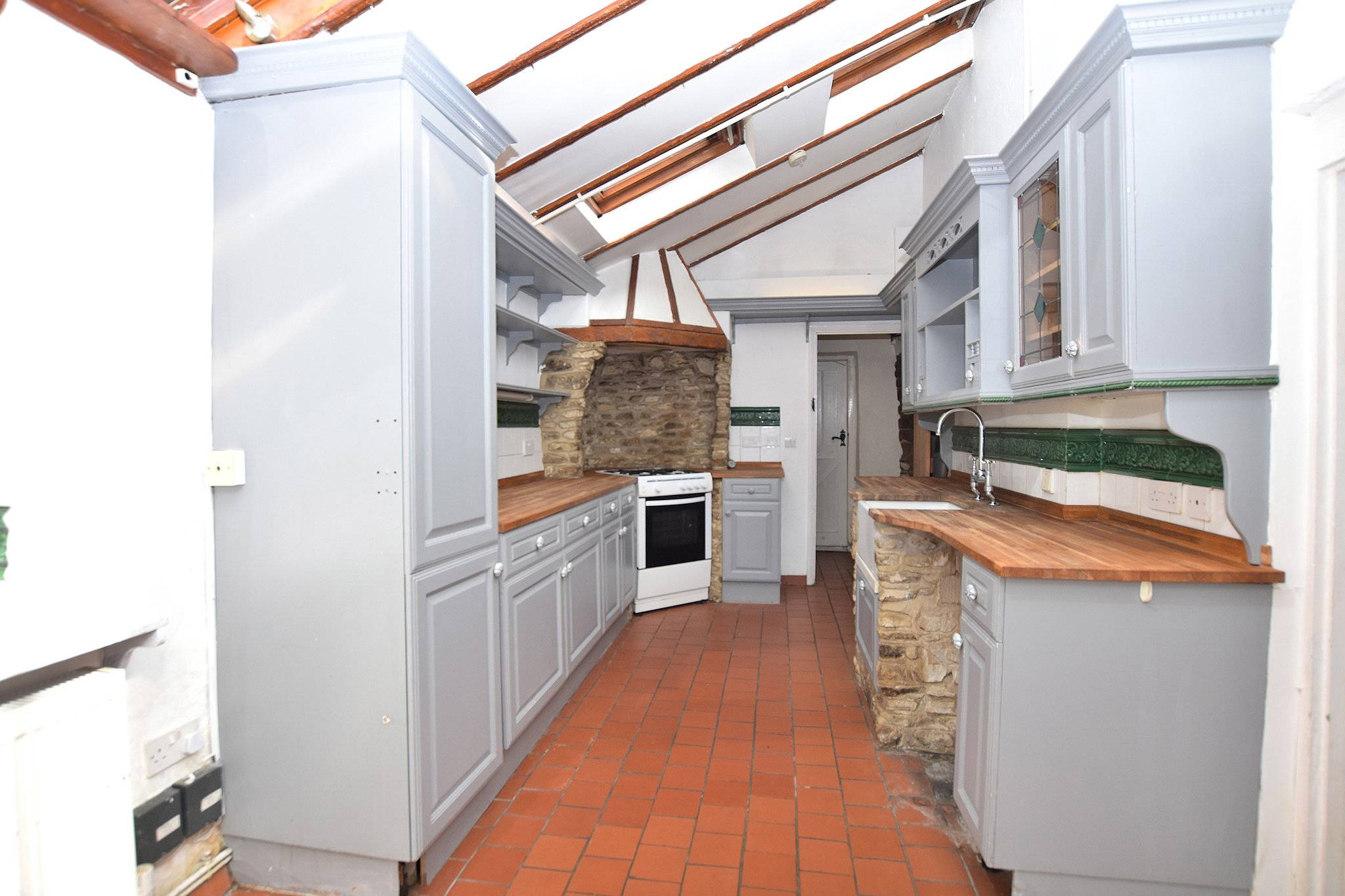 The kitchen is fitted with a range of traditional-style units complemented by solid wood work surfaces and a Belfast sink, all set against exposed stonework which adds warmth and authenticity. A feature chimney breast with stone surround creates a natural focal point, enhancing the room’s period charm.