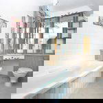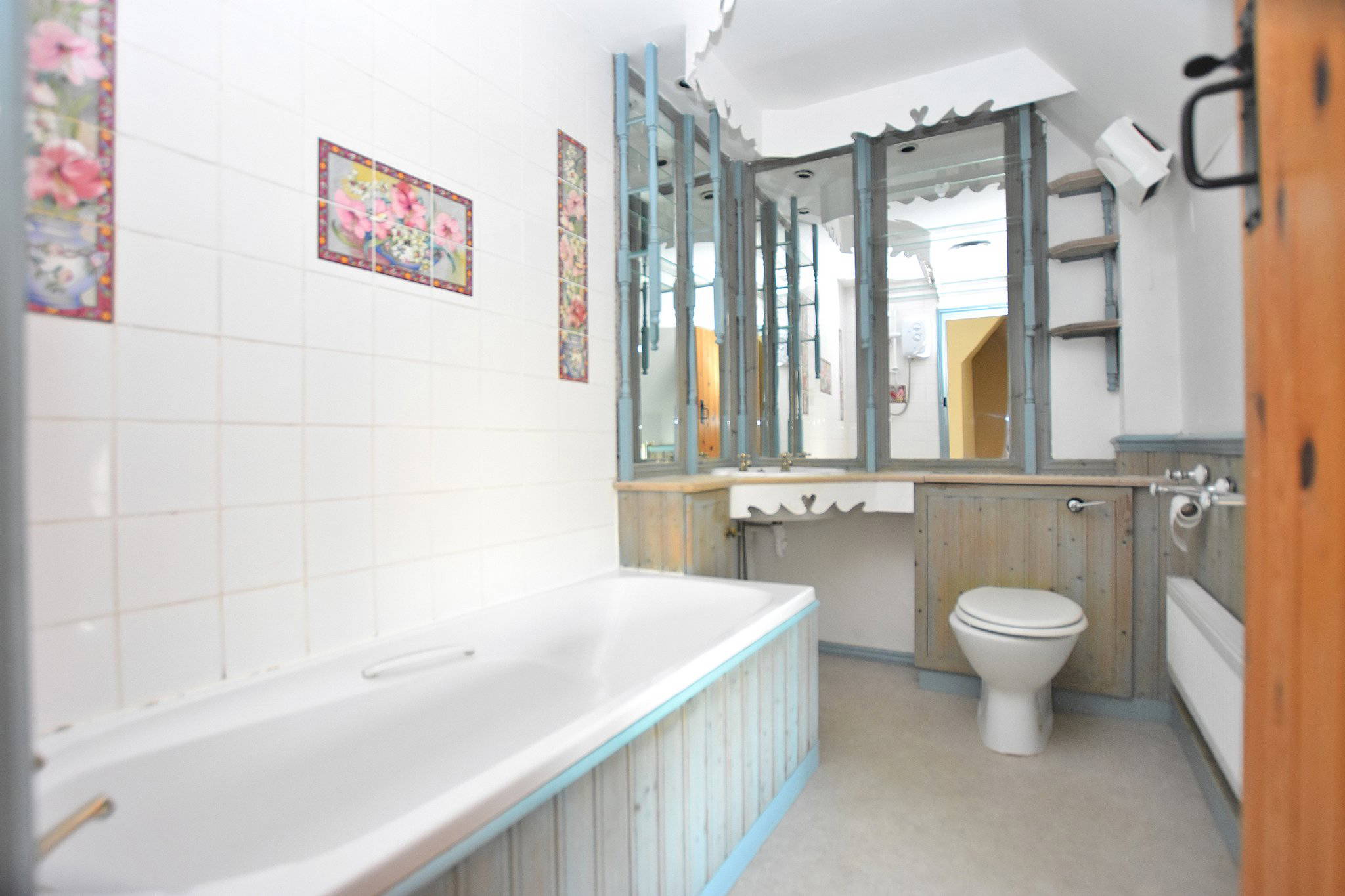 A generously sized family bathroom fitted with a panelled bath, WC and wash hand basin. The room is complemented by distinctive timber panelling and a mirrored vanity area, creating a unique and characterful finish.
