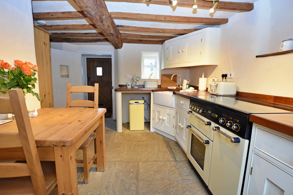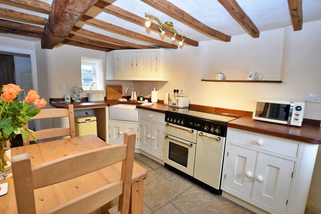 BREAKFAST KITCHEN 11' 7" x 12' 5" max (3.53m x 3.78m) Wall and base units with wooden work surfaces over. Sink with mixer tap. Range style cooker. Flagstone flooring. Space for fridge freezer and washing machine. Windows to front and rear aspects.