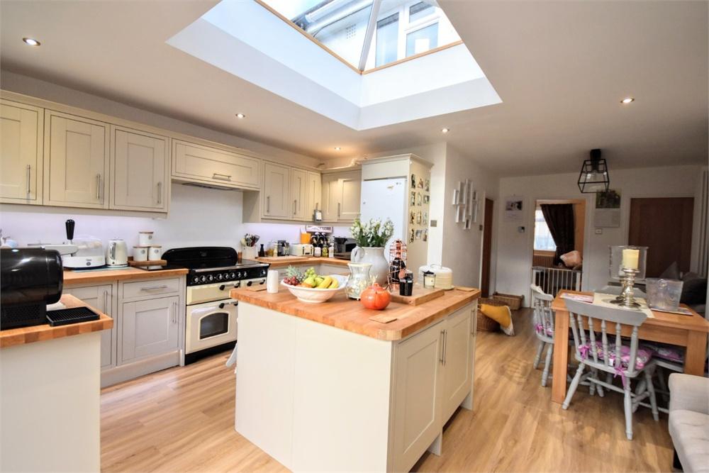 4.37m x 6.93m (14' 4" x 22' 9") Refitted bespoke solid wood kitchen with a central island and solid oak butchers block work surfaces over, Belfast Butler sink with mixer tap over, Range Style cooker, dishwasher, fridge/freezer, washing machine, wood flooring, cupboard, Bifold doors, space for a dining table and seating area.